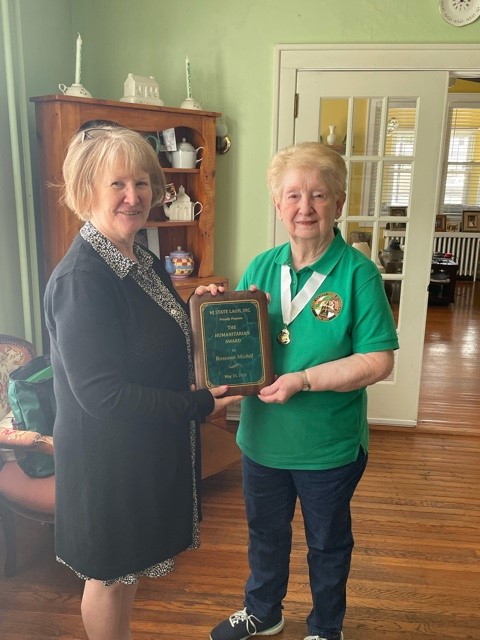 NJ LAOH Past State President Roseann Michel (right) received the Humanitarian Award on May 15, 2021, at the NJ State LAOH Convention. NJ LAOH Secretary Maread Gallagher (left) made the presentation on behalf of the New Jersey LAOH State Board.