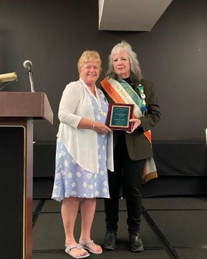 On Saturday, May 20, 2023, the New Jersey LAOH State Board was installed at the APA Hotel in Woodbridge, NJ. Officers shown from left: Eileen Daly, State Catholic Action; Lauren Tracy, State Irish Historian; Maread Gallagher, State Vice-President; Mary Paglione, LAOH Past National President; Jacoba Kenna, State President; Marilyn Madigan, National LAOH President; Kate McGrath, State Secretary; Nancy Rhodes, State Treasurer, and Denise McInerny, State Missions & Charities. Congratulations to our new officers for 2023-2025! Also pictured is LAOH State President, Jacoba Kenna, presenting Deborah Potkay with the 2023 LAOH Humanitarian Award.