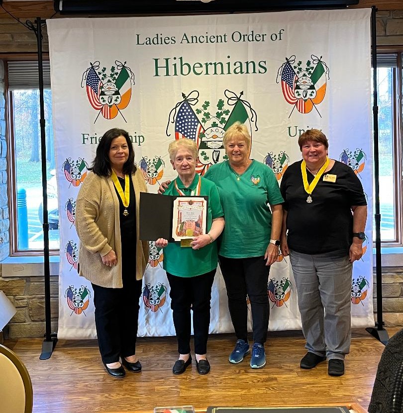 We are pleased and proud to announce that NJ LAOH Past State President, Roseann Michel, was awarded the National LAOH Life Membership at the LAOH Interim Board Meeting on November 11, 2023, in Cleveland, OH. The National Life Membership is awarded to a LAOH member who has had outstanding and distinguished service to Hibernianism. Shown from the left is National LAOH Secretary Sandi Swift, NJ LAOH PSP Roseann Michel, NJ State President Jacoba Kenna and National LAOH President Marilyn Madigan.